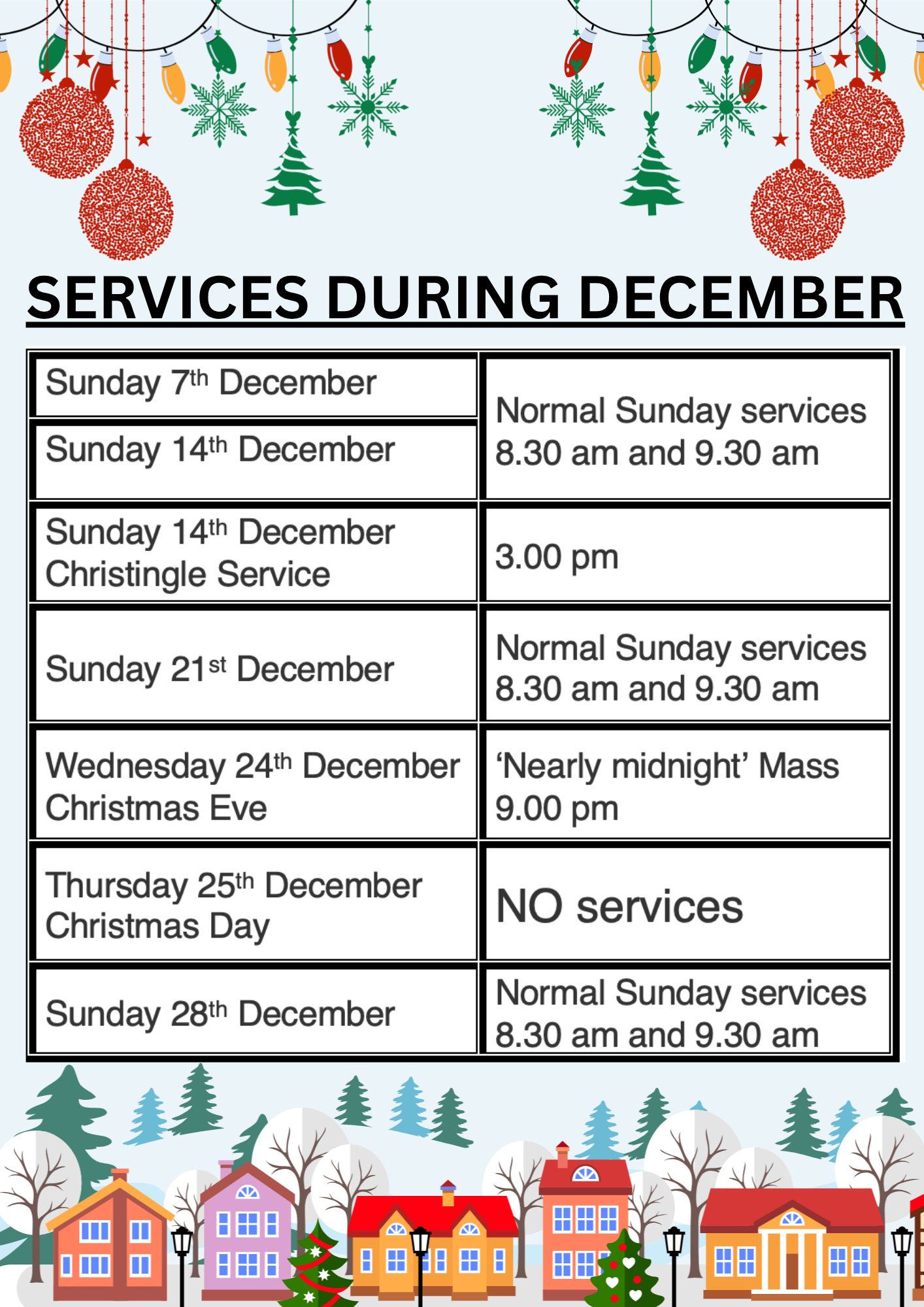 Please note: there will not be a service on Christmas Day. For information regarding individual services during December, refer to the 'Services and Events'. Also, information can be viewed on the attached file.