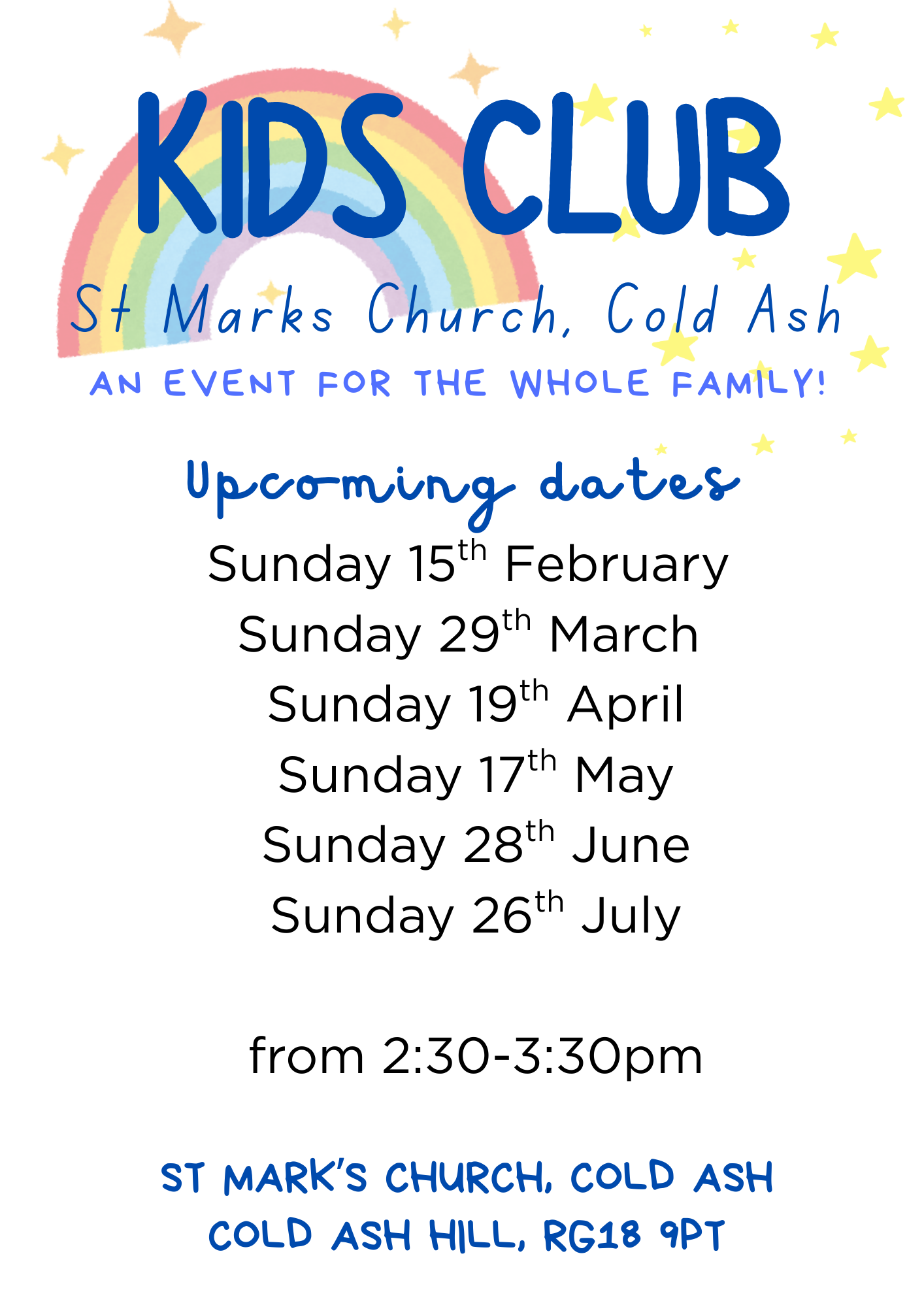 We usually meet from 2:30-3:30 in church on the third Sunday of the month and our next session is on Sunday 15th February for a Pancake Party! Please see our attached flyer for exact dates in 2026 as we have moved some weeks to avoid important family occasions like Mother's Day.