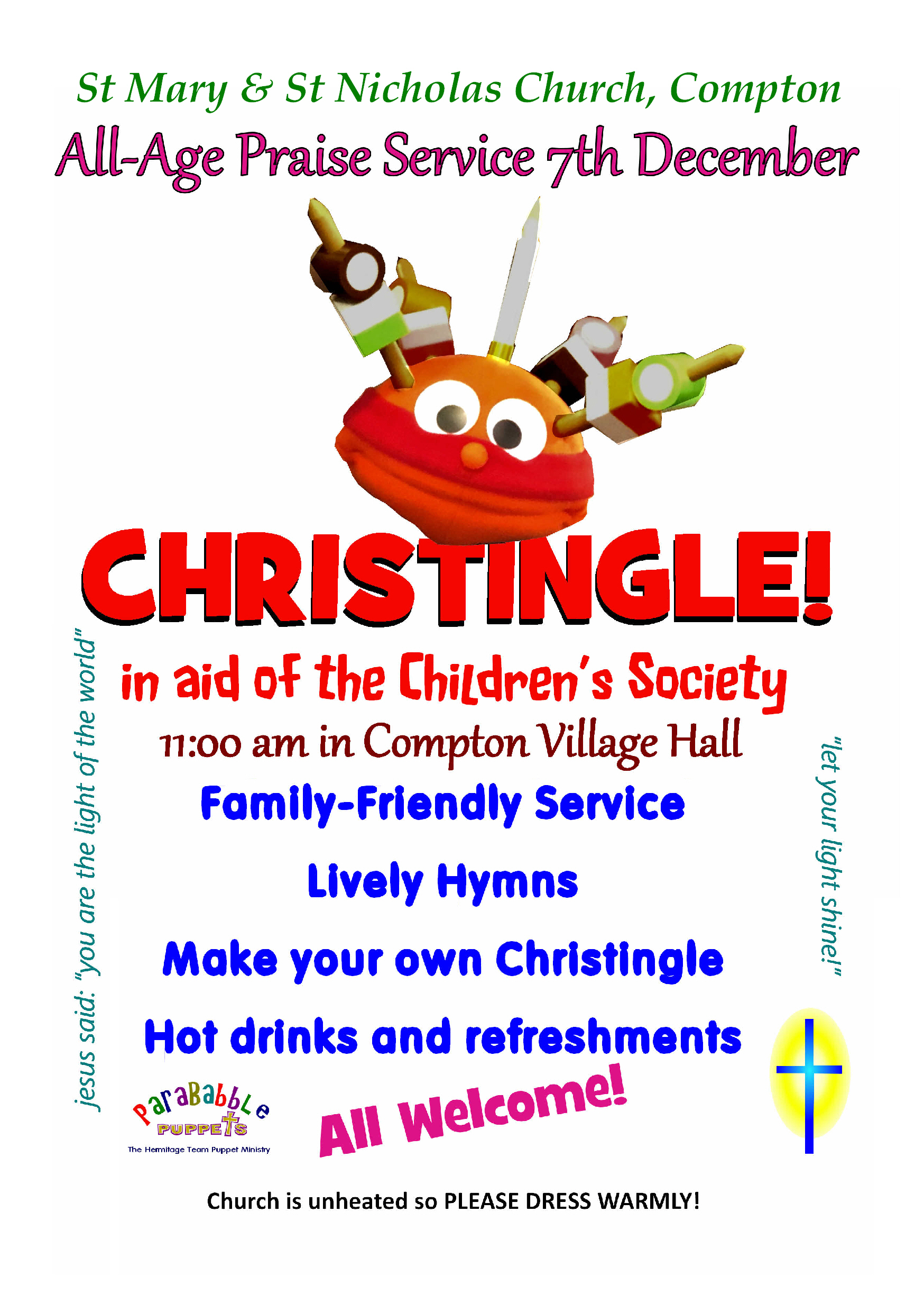 Our service on Sunday 7 December will be a Christingle service IN THE VILLAGE HALL.