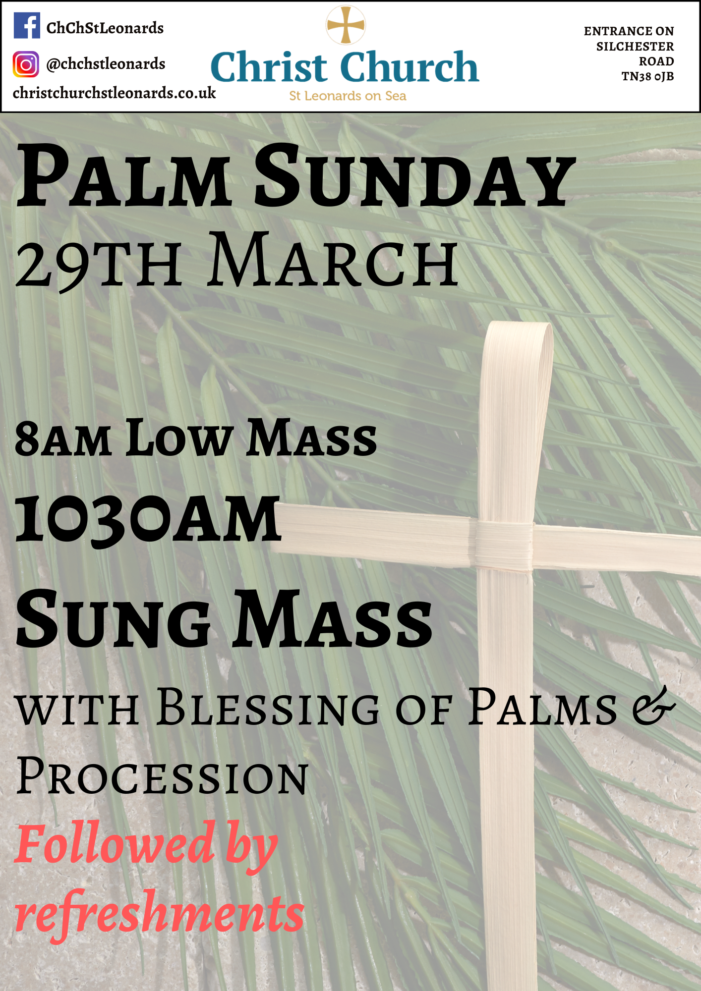 Mass begins with the Blessing of Palms in the Church Courtyard on London Road (TN37 6GL) we then process through the local streets to the church where the service continues. With Sunday School and refreshments after Mass. Everyone is welcome to join us