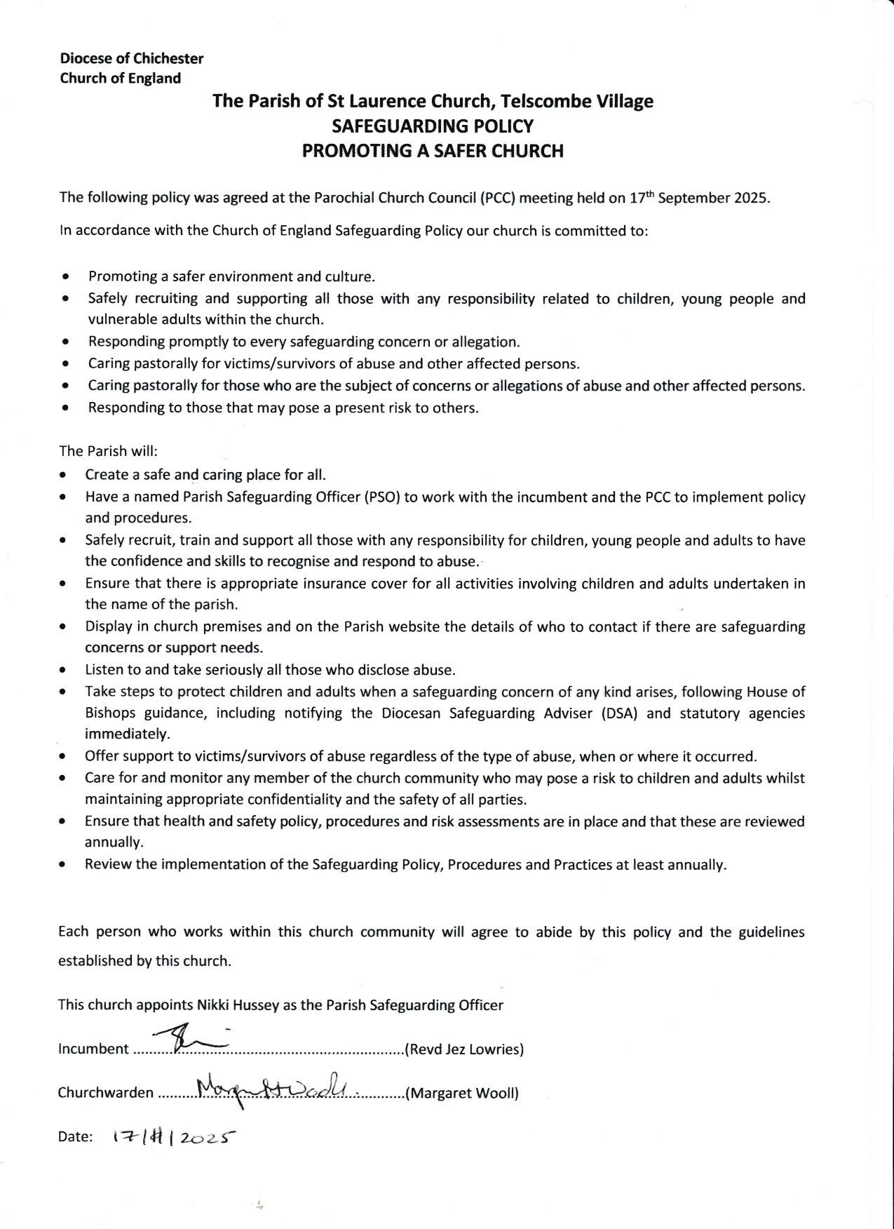 The parish of Telscombe Village is committed to the safeguarding of children, young people and adults. We follow the House of Bishops guidance and policies and have our own Parish Safeguarding Officer (PSO). The Diocese of Chichester’s safeguarding pages contain vital links and information including contacts for the Diocesan Safeguarding Advisor (DSA) who advise our PSO. If you are concerned that a child or adult has been harmed or may be at risk of harm please contact the DSA. If you have immediate concerns about the safety of someone, please contact the police and your local authority Children or Adults Services.