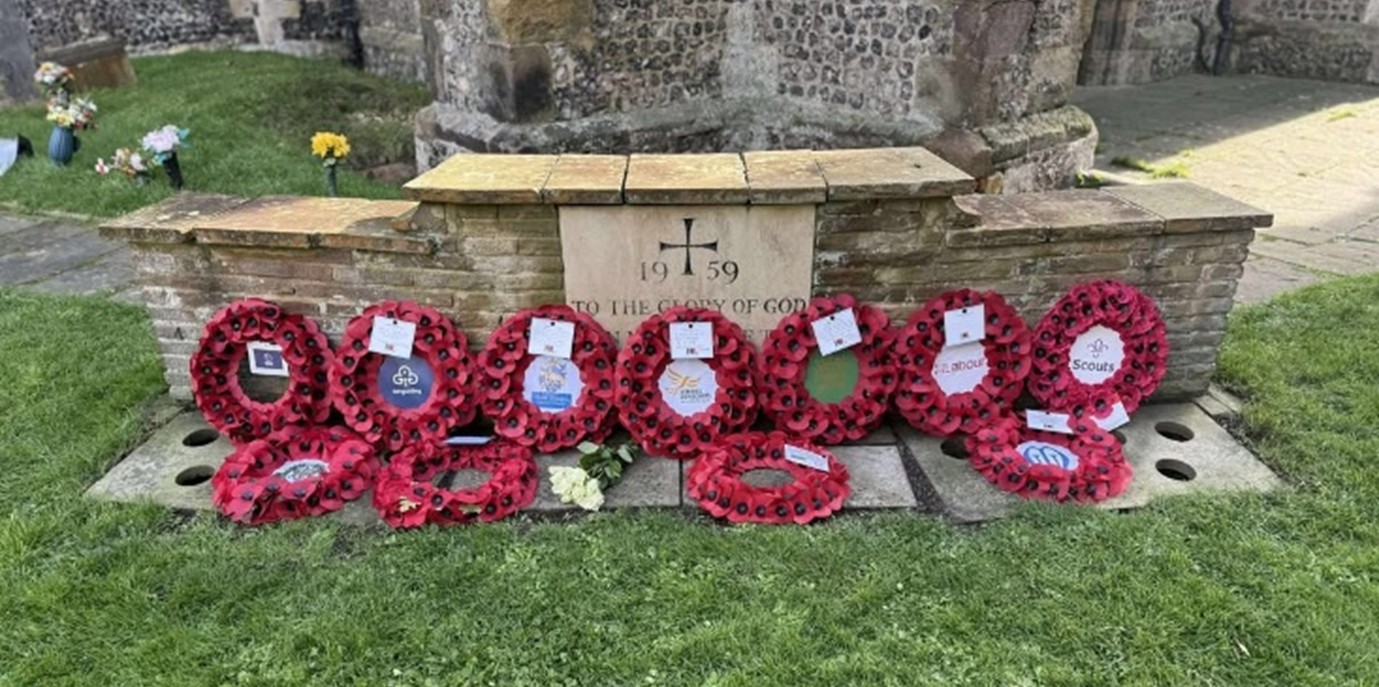 The service culminated with the Act of Remembrance held in the Churchyard, during which wreaths were laid (seen in bottom picture) by representatives of: Dr Beccy Cooper, MP for Worthing West; East Worthing and Shoreham Labour Party; LibDem Party Representative; West Worthing Conservative Association; 1st Worthing Guides; 8th Worthing Sea Scouts; Worthing 4 Refugees; Worthing Veterans Association; Adur Ukraine Support Association; St Andrew’s Church; and St Andrew’s Mothers Union.