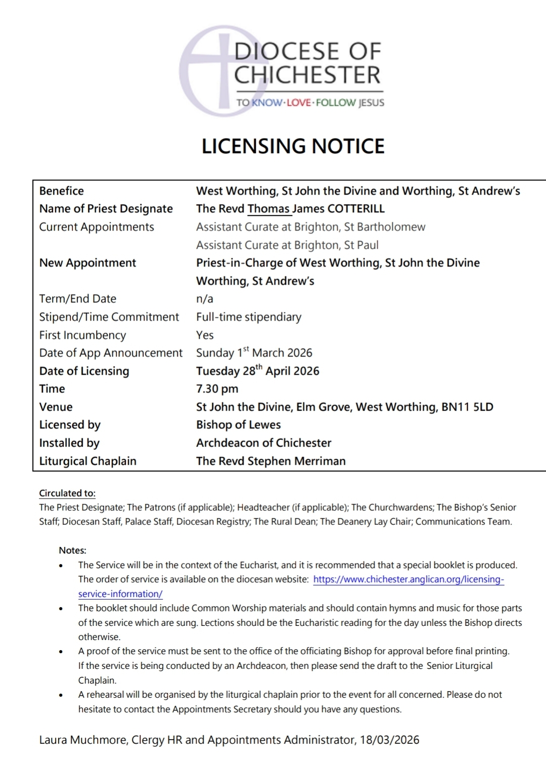 Please see the Licensing Notice for details. We hope you can join us on Tuesday, 28th April at 7:30 pm for this special service.