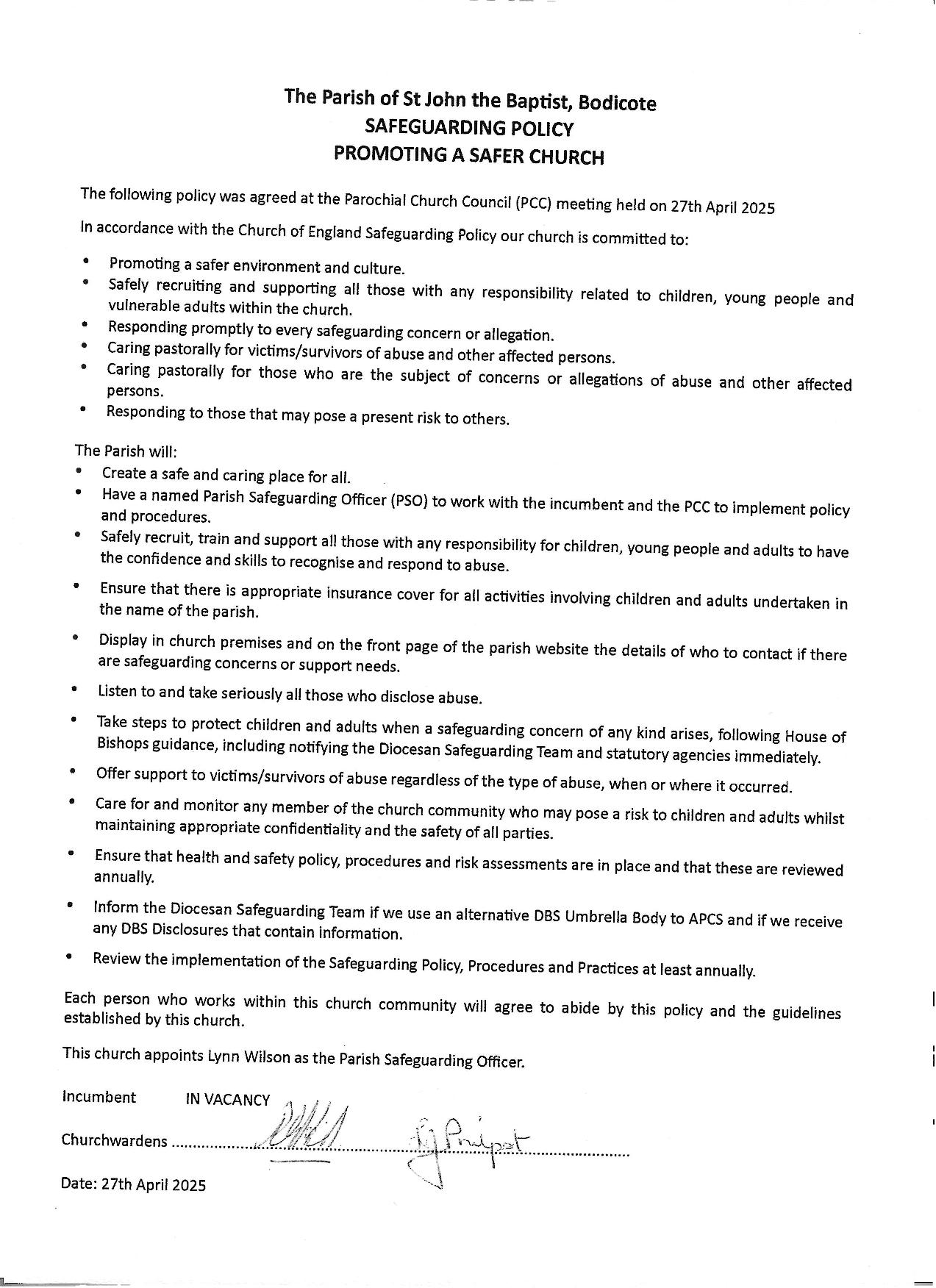To this end, we have adopted the 'promoting a safer church' commitment as part of our safeguarding policy. The policy is reviewed at least annually at our Annual Parochial Church meeting.