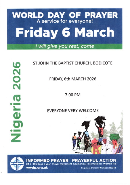 The World Day of Prayer service will take place at 7.00 pm on Friday, 6th March. This year it has been written by the Christian women in Nigeria and we shall be joining the worldwide movement as services will be held throughout the world on this day at local times. The people who will take part in this meaningful service here in Bodicote would greatly appreciate your support at this time and hope to see you there.