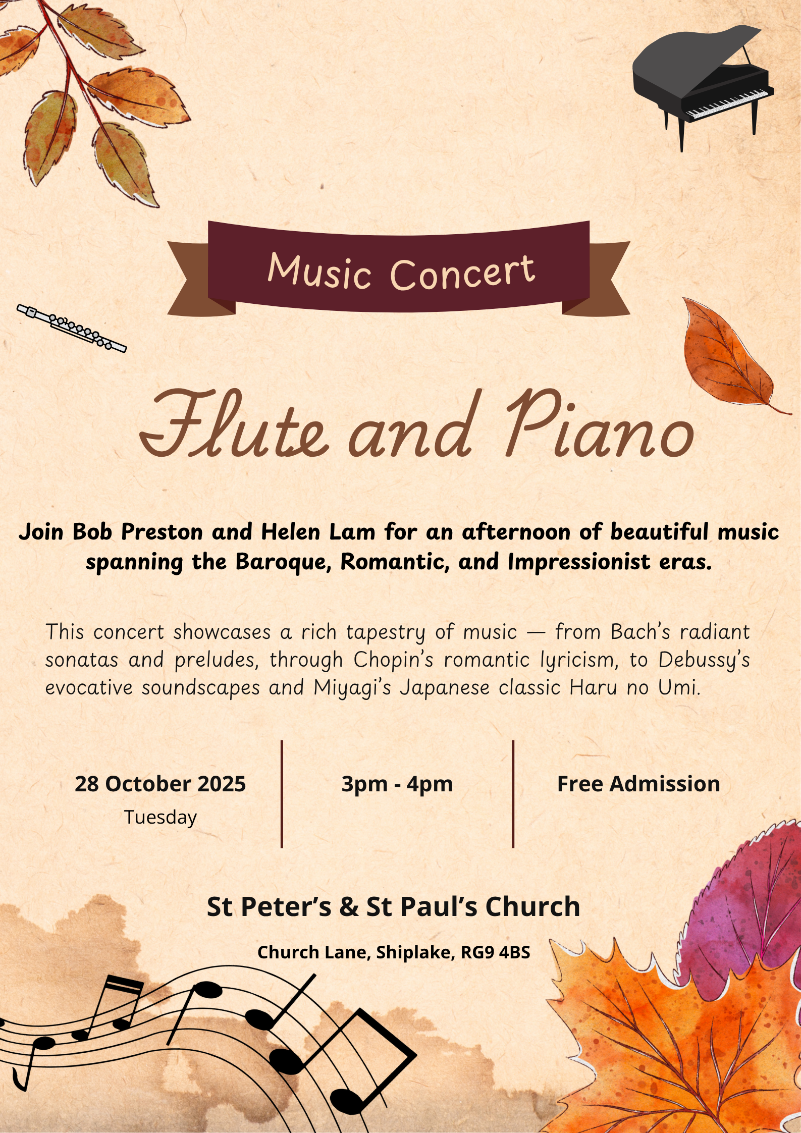 Join us for a beautiful afternoon of music for flute and piano. The programme features timeless works by Bach and Debussy, alongside favourites by Chopin, Rachmaninoff, and Dvořák.