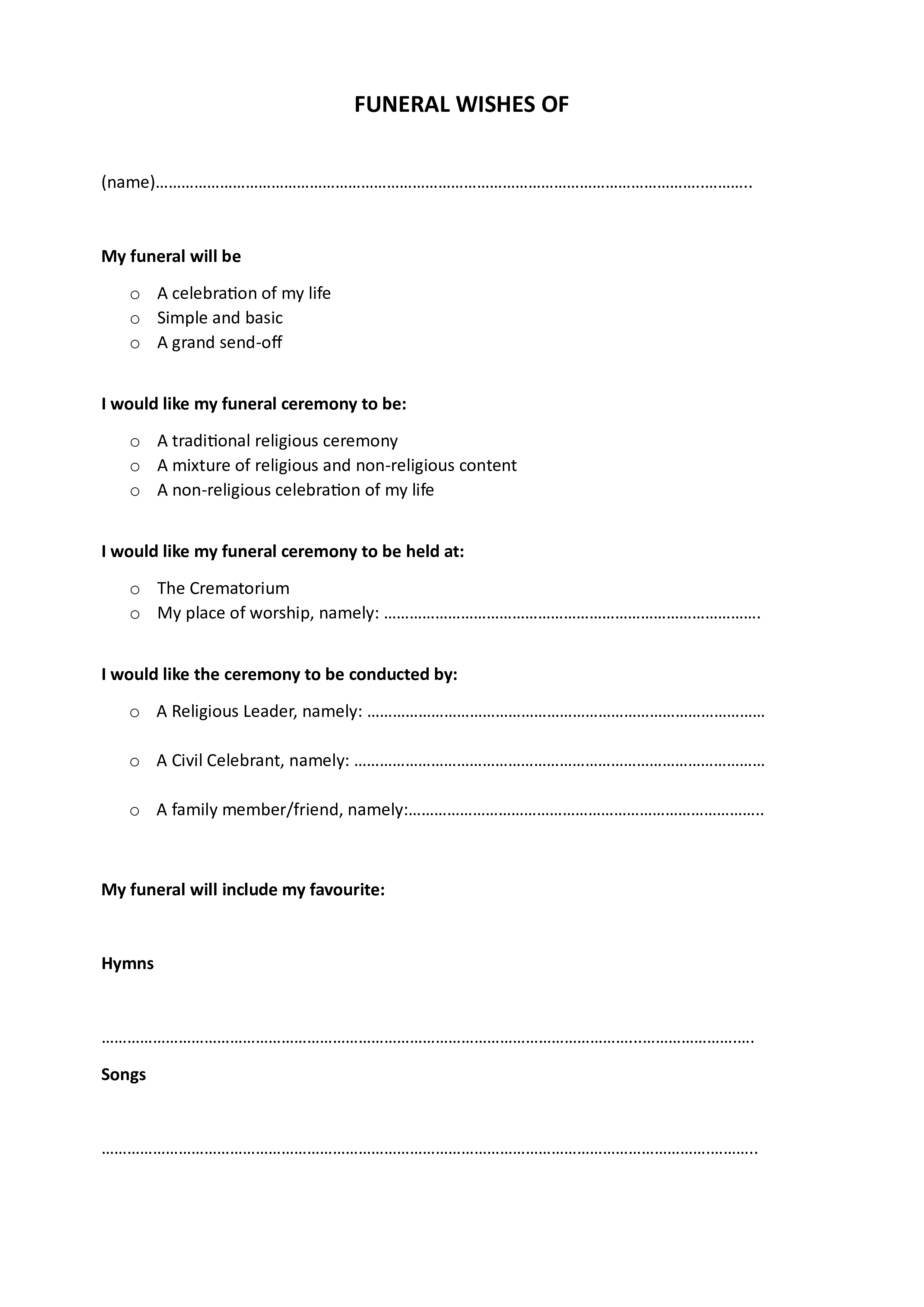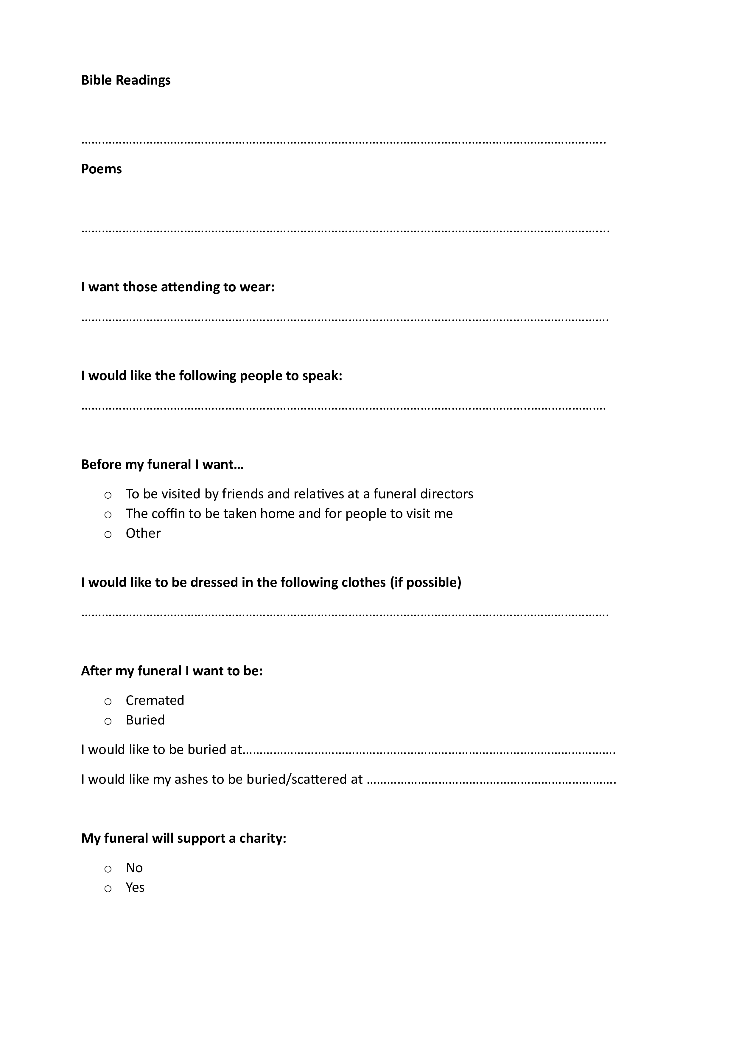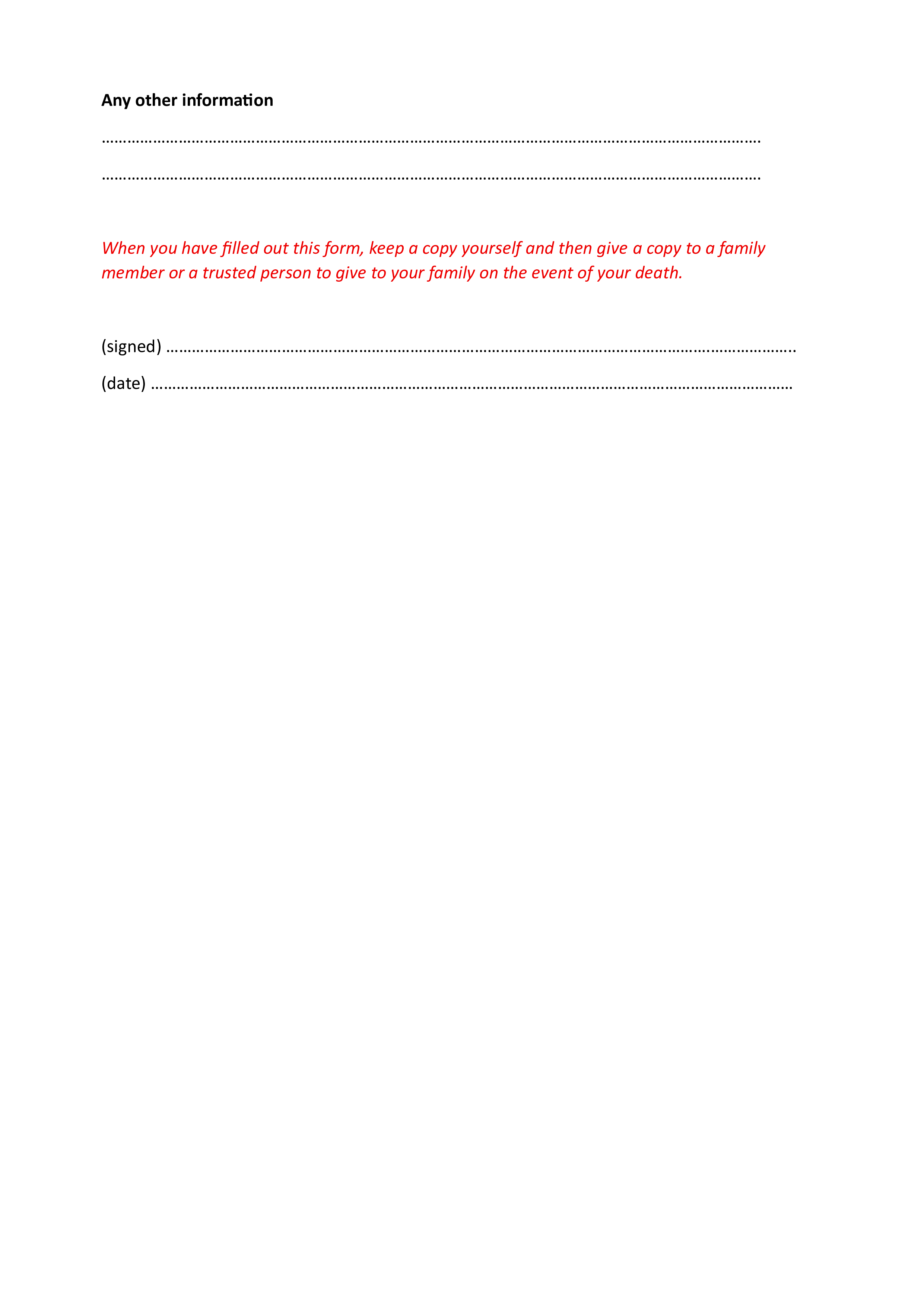 You can count me among those that don't really want to think about my death or funeral, but I also know that I don't want my family to have to stress about it either and so I will be filling out this form and leaving it for them so that, come that time, all my wishes will be available to them and funeral planning will be be least of their concerns.I hope that you can use this form in that way too. Feel free to put it somewhere safe and tell them where it is, or give it to me for safe keeping and tell them I have it. Whatever you decide to do, I hope it brings comfort and peace to all.Love and prayers always,Sally x