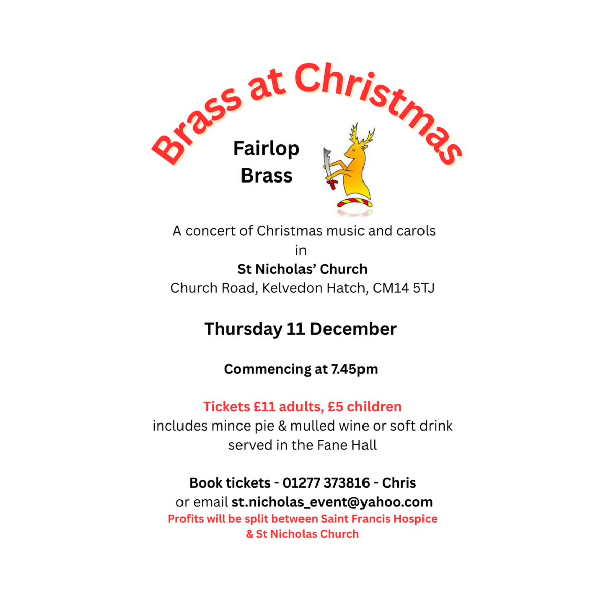 Fairlop Brass band will come and play a concert of Christmas music and carols in St Nicholas' Church, Church Road, Kelvedon Hatch, CM14 5TJ. This is a fundraiser for St Nicholas Church. Tickets £11 adults and £5 children, which includes mince pie & mulled wine or soft drink, to be served in The Fane Hall. Contact Chris Jardine on 01277 373816 to book tickets or email: [email protected]