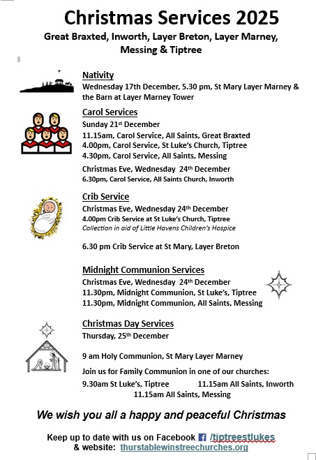 We are part of the new Heathland Parish, part of the larger Blackwater Benefice now being formed. Here are details of the Christmas Services in our group of 6 churches: All Saints Great Braxted, All Saints Inworth, All Saints Messing, St Luke's Tiptree, St Mary Layer Breton & St Mary Layer Marney: