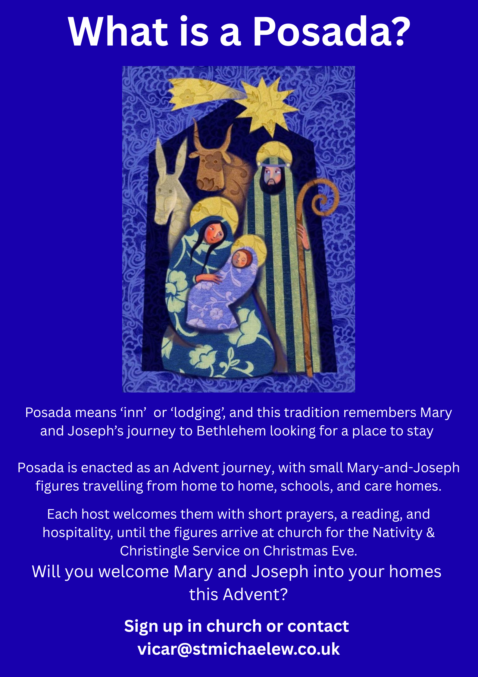 For full details, directions and any last-minute updates, find out more here: https://www.stmichaelew.co.uk/welcome.htm