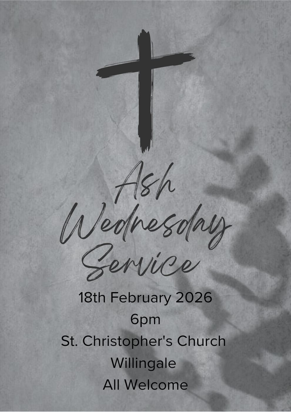 Please join us for our Ash Wednesday service on 18th February at 6pm. All welcome.