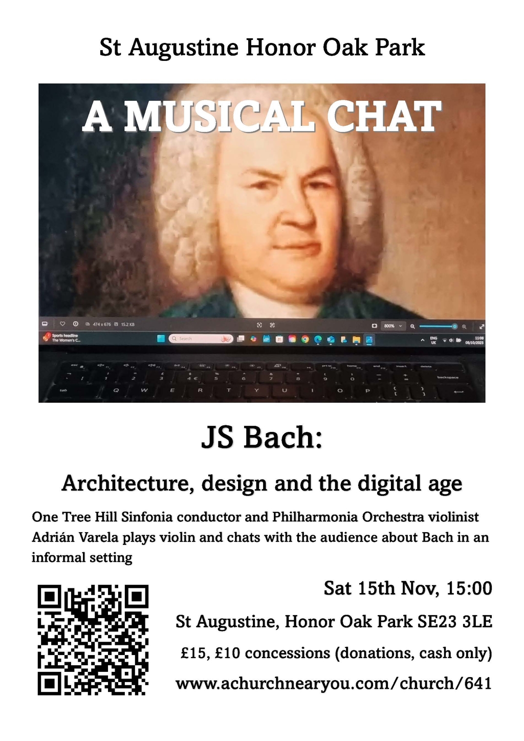 Saturday 15th November 3.00pm A MUSICAL CHAT JS Bach: Architecture, design and the digital age One Tree Hill Sinfonia conductor and Philharmonia Orchestra violinist Adrián Varela plays violin and chats with the audience about Bach in an informal setting £15, £10 concessions (donations, cash only)
