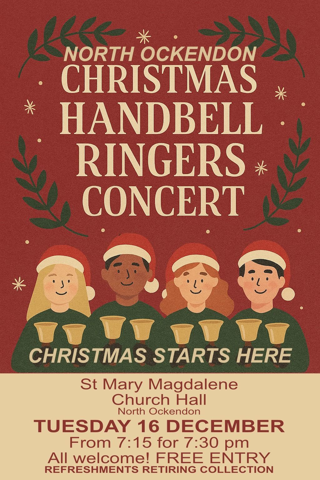 The North Ockendon Handbell Ringers invite you to their Christmas Concert in the church hall.