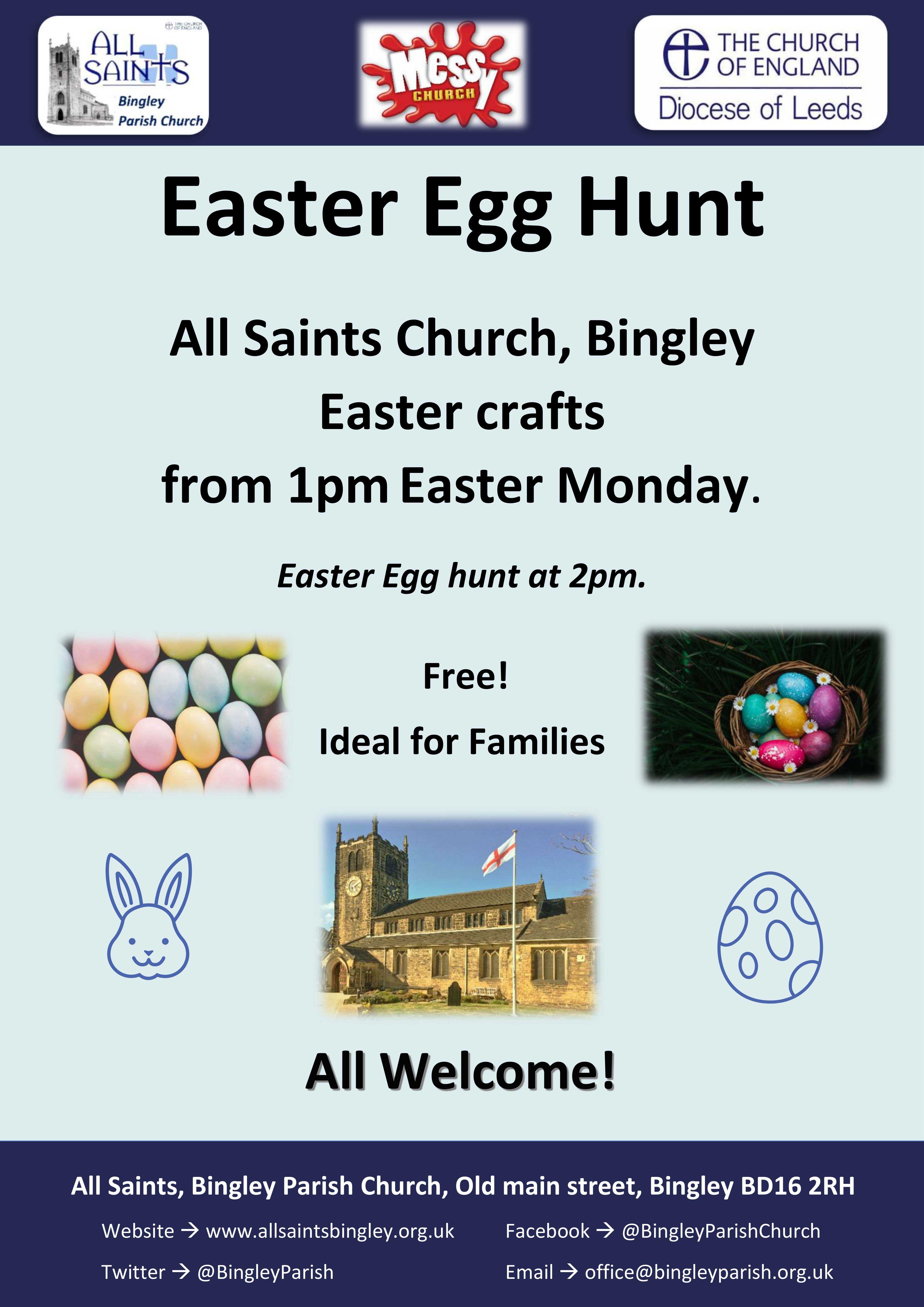 Join us on Easter Monday from 1pm for family Easter activities and a Egg Hunt (2pm).Fun, Faith and Games.FREEAll welcome