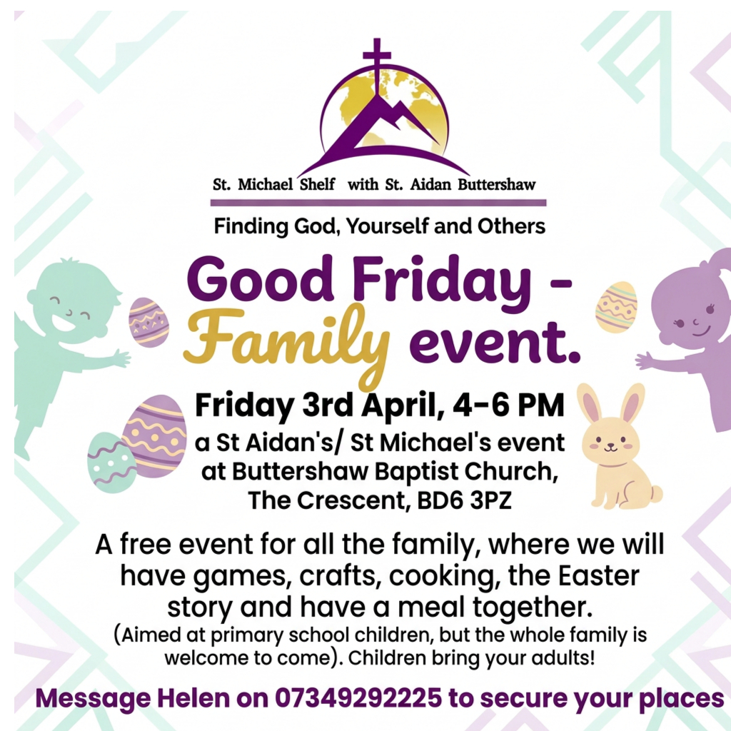 Held at Buttershaw Baptist Church by St Michaels Shelf with St Aidans Buttershaw. A fun family event with crafts, cooking, food and the Easter Story.