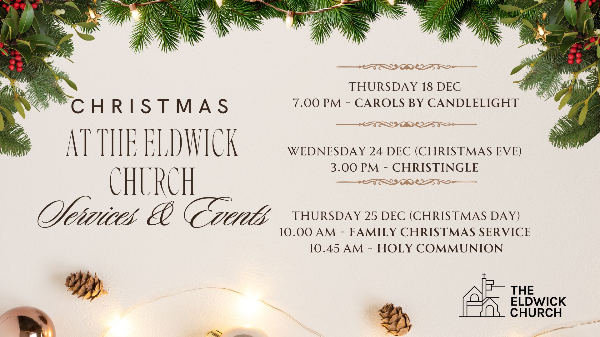 Thursday 25 Dec (Christmas Day)- 10.00 am - Family Christmas service and 10.45 am - Holy Communion
