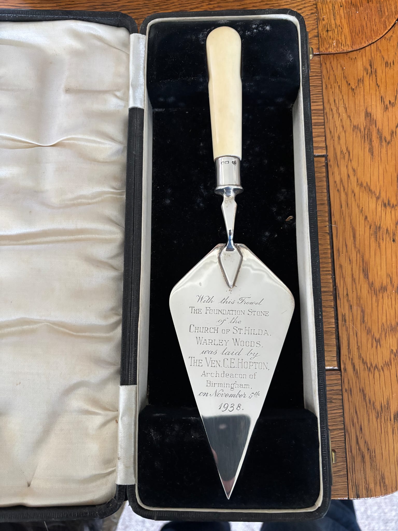With this trowel the foundation stone of the church of St. Hilda Warley Woods was laid by The Ven. CE. Hopton, Archdeacon of Birmingham, November 5 1938.