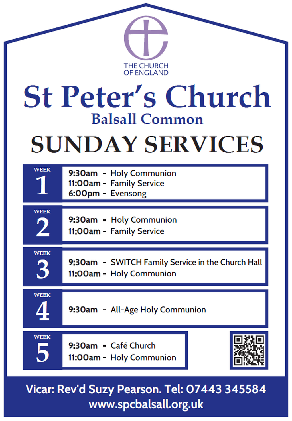 St Peter's is the Anglican church for the parish of Balsall Common in the Church of England Diocese of Birmingham. We are a friendly, inclusive, and welcoming church committed to sharing the love of God with our local community and beyond.