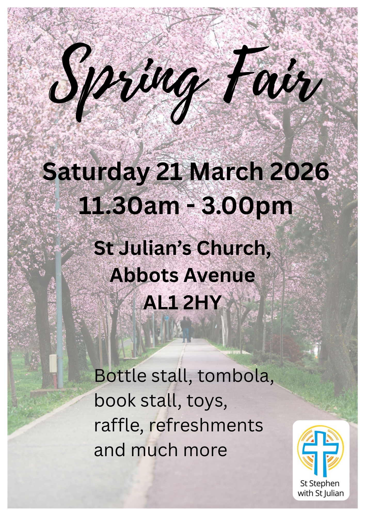 Spring Fair, with tombola, raffle, stalls for cakes, plants and books, treasure hunt and refreshments.