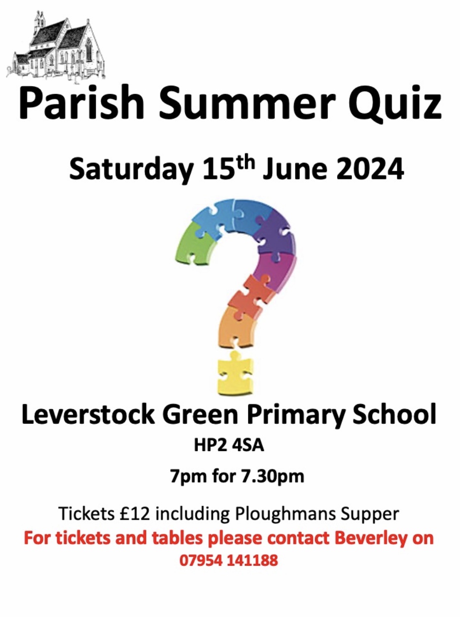 Quiz Night and SupperLeverstock Green School Hall - 7pm for 7.30pm start Tickets £12, incl. Ploughman’s supper Book tickets or tables of 8 via Beverley Burgess on 07954 141188