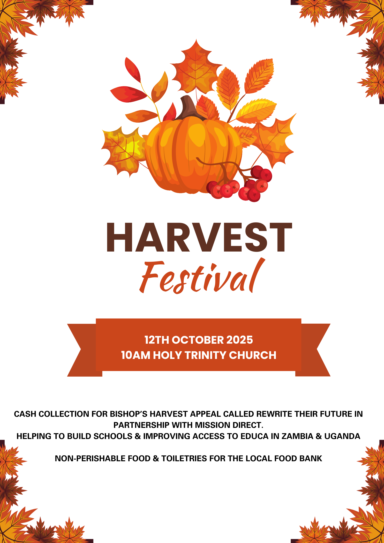 We will be collecting non-perishable goods and toiletries for the Bennetts End Foodbank or cash donations for the Bishop's Harvest Appeal in support of Educational projects in Zambia & Uganda
