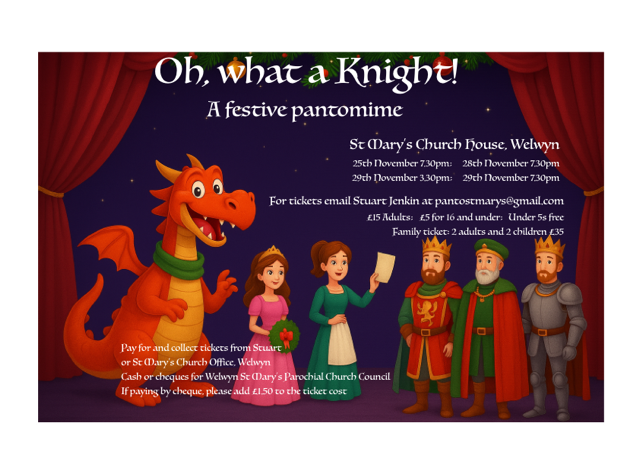 Pay and collect tickets from Stuart Jenkin or from St Mary’s Church Office, Welwyn. Cash or cheques for Welwyn St Mary’s Parochial Church Council. If paying by cheque please add £1.50 to the cost.