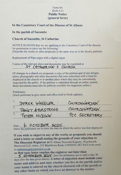 We are applying to the Consistory Court of the diocese for permission to carry out the following works: replace the pipe organ with a digital organ.