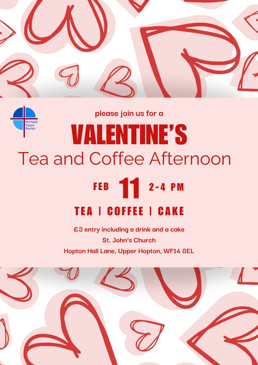 Come along to our Valentine's Tea and Coffee afternoon at St. John's Church for teas, coffees, cakes, biscuits and crafts!
