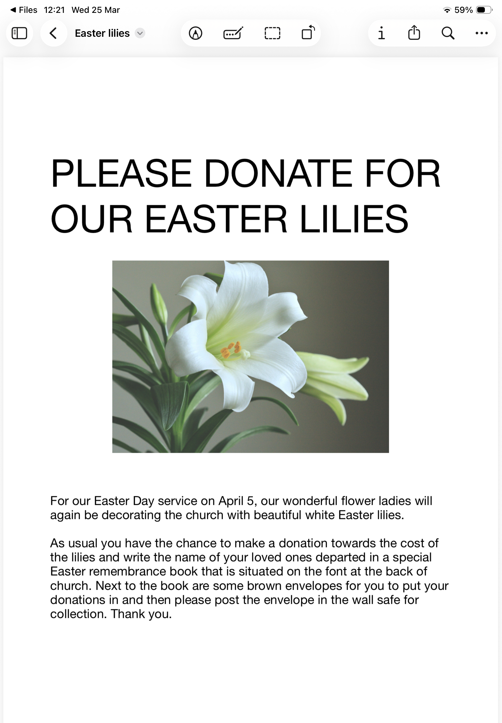 See details of how you can make a donation to our Easter lilies collection and enter into our remembrance book the name (or names) of those you wish to remember.