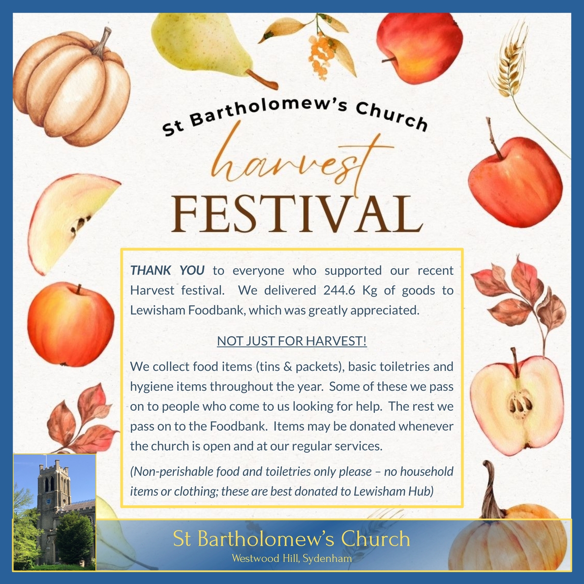 THANK YOU to everyone who supported our recent Harvest festival. We delivered 244.6 Kg of goods to Lewisham Foodbank, which was greatly appreciated.