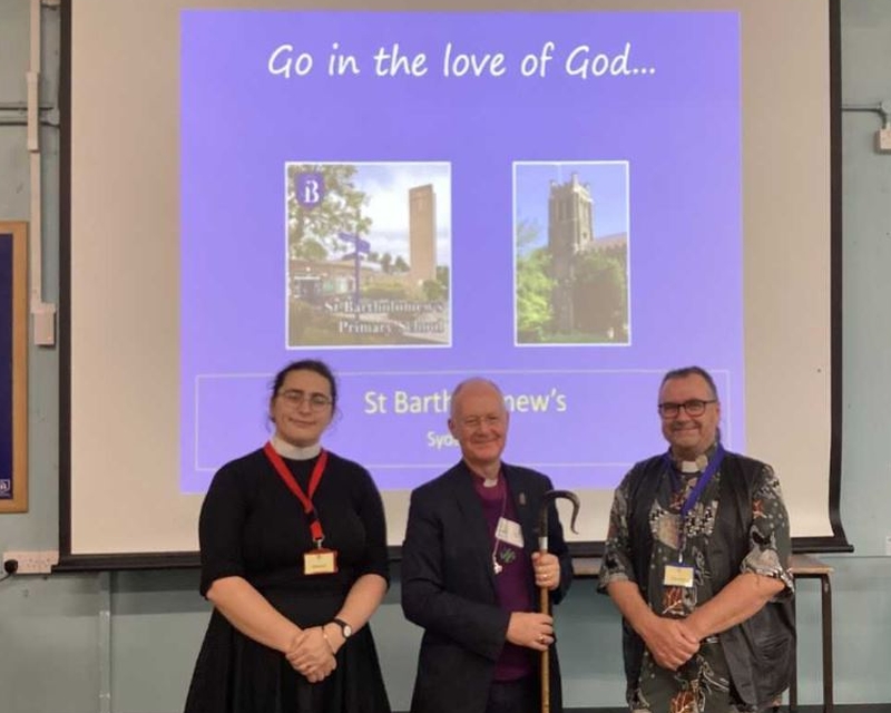 (photo is Bishop Alastair with Rev'd Jim and Mthr Bethany following school collective worship.)