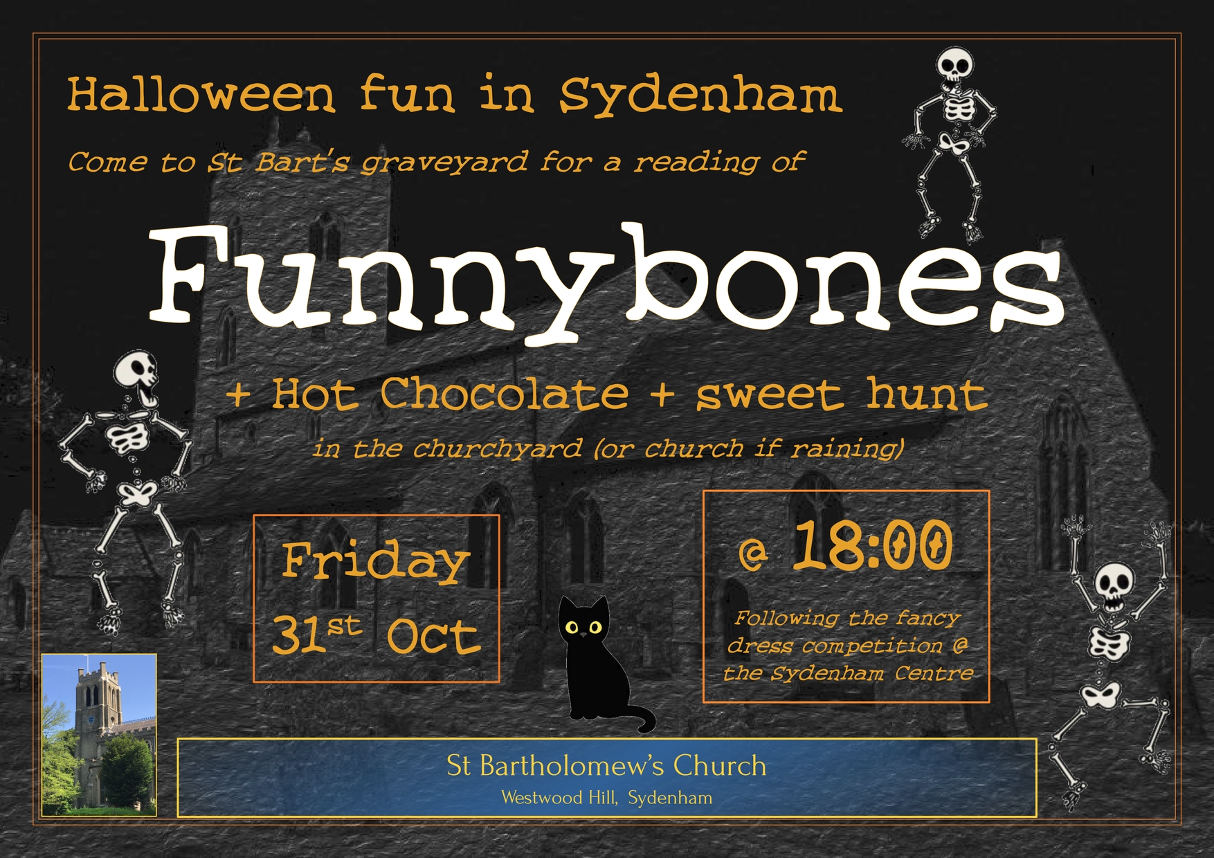 Joining in with the Halloween fun in Sydenham. A reading of Funnybones in the graveyard @ 18:00, following the fancy dress competition at the Sydenham Centre.