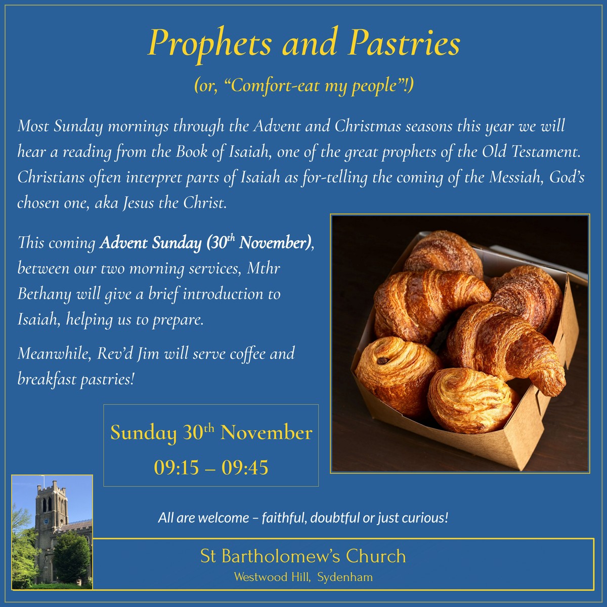 This Advent Sunday (30th November), between our two morning services, Mthr Bethany will give a brief introduction to Isaiah, helping us to prepare. Meanwhile, Rev’d Jim will serve coffee and breakfast pastries!
