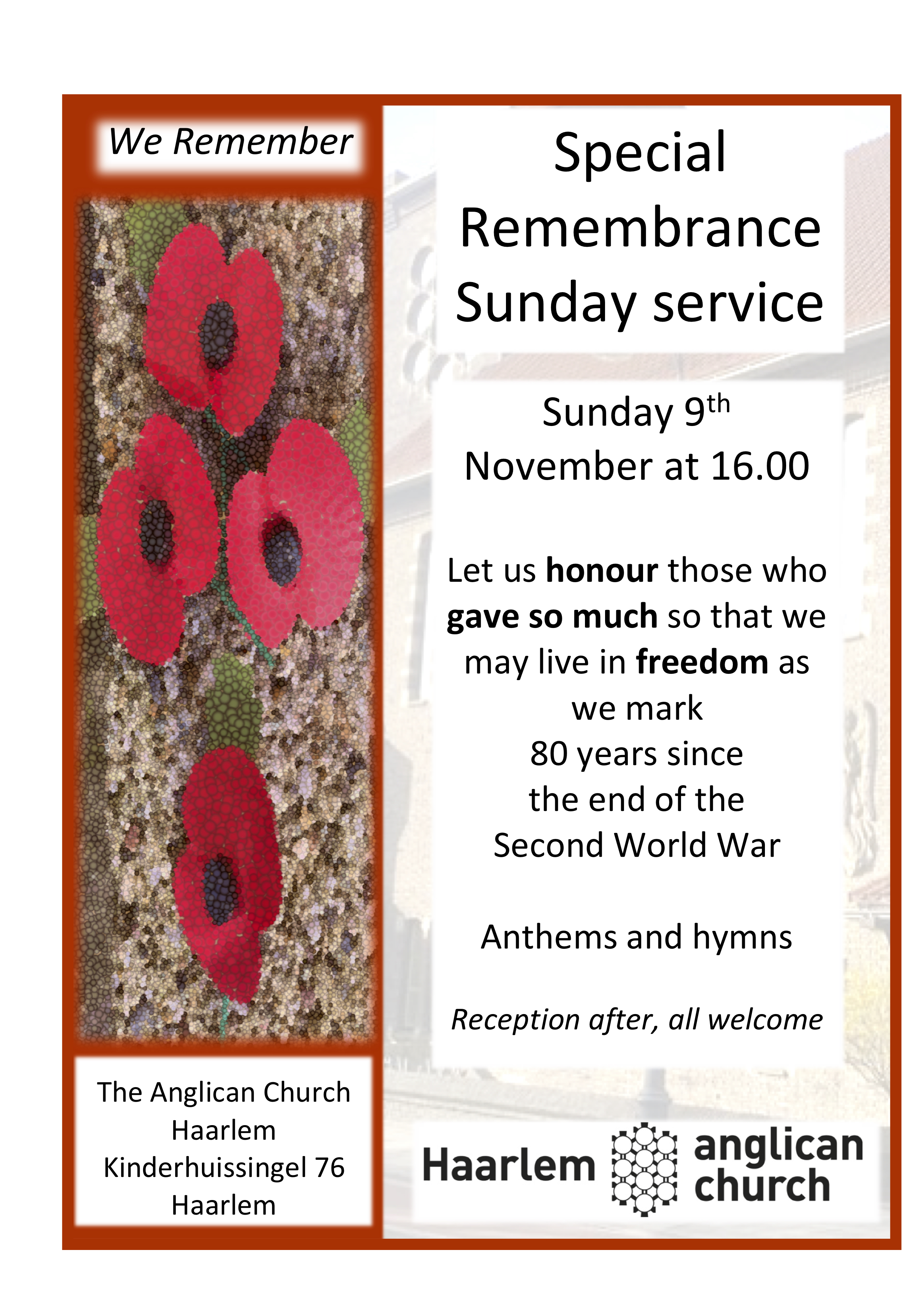 2025 marks the 80th anniversary of the World War II and commemorates 80 years of freedom. On Remembrance Sunday 9 November Haarlem Church will have a special choral Remembrance Service to celebrate 80 years of freedom, but also to remember all the sacrifices that have been made - and are still being made - by so many so that we are able to live in freedom.