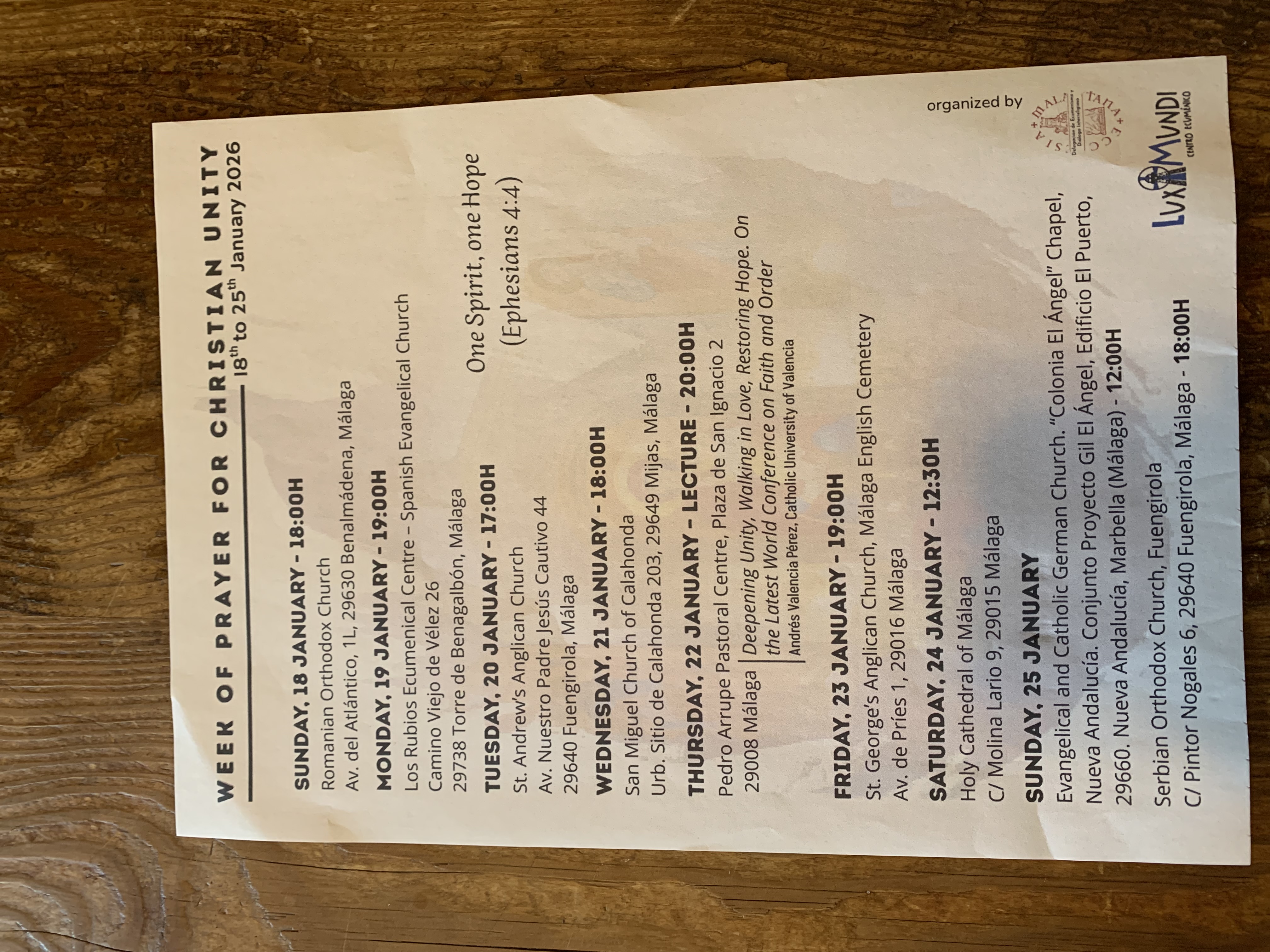In this WoPfCU, we are holding a service at our Los Boliches centre of St Andrew. Churches from all denominations serving our community are invited to this hour long service.