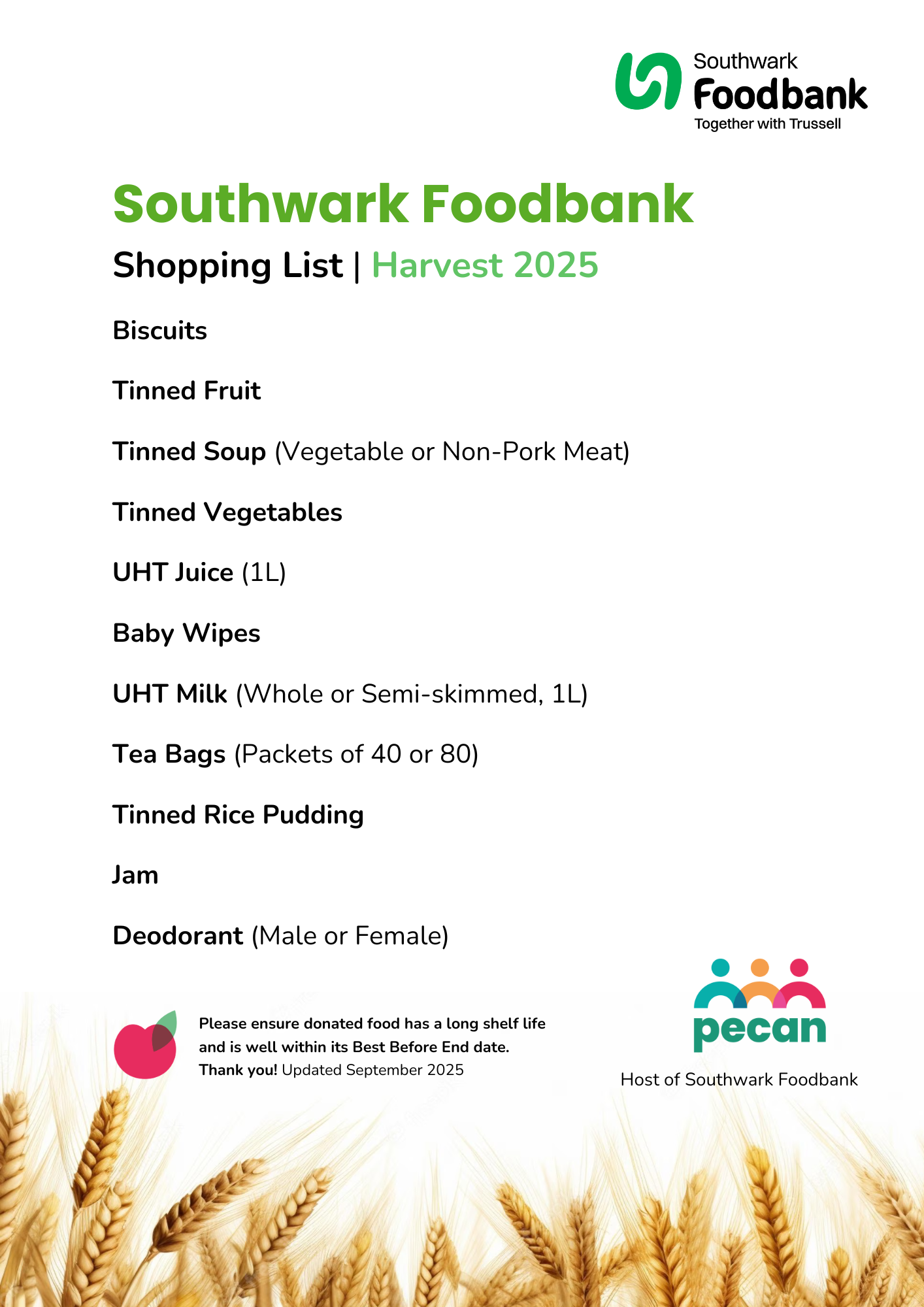 If you would like to donate to the Southwark Foodbank, please see the list below and bring anything you can offer to church on the 5th October.