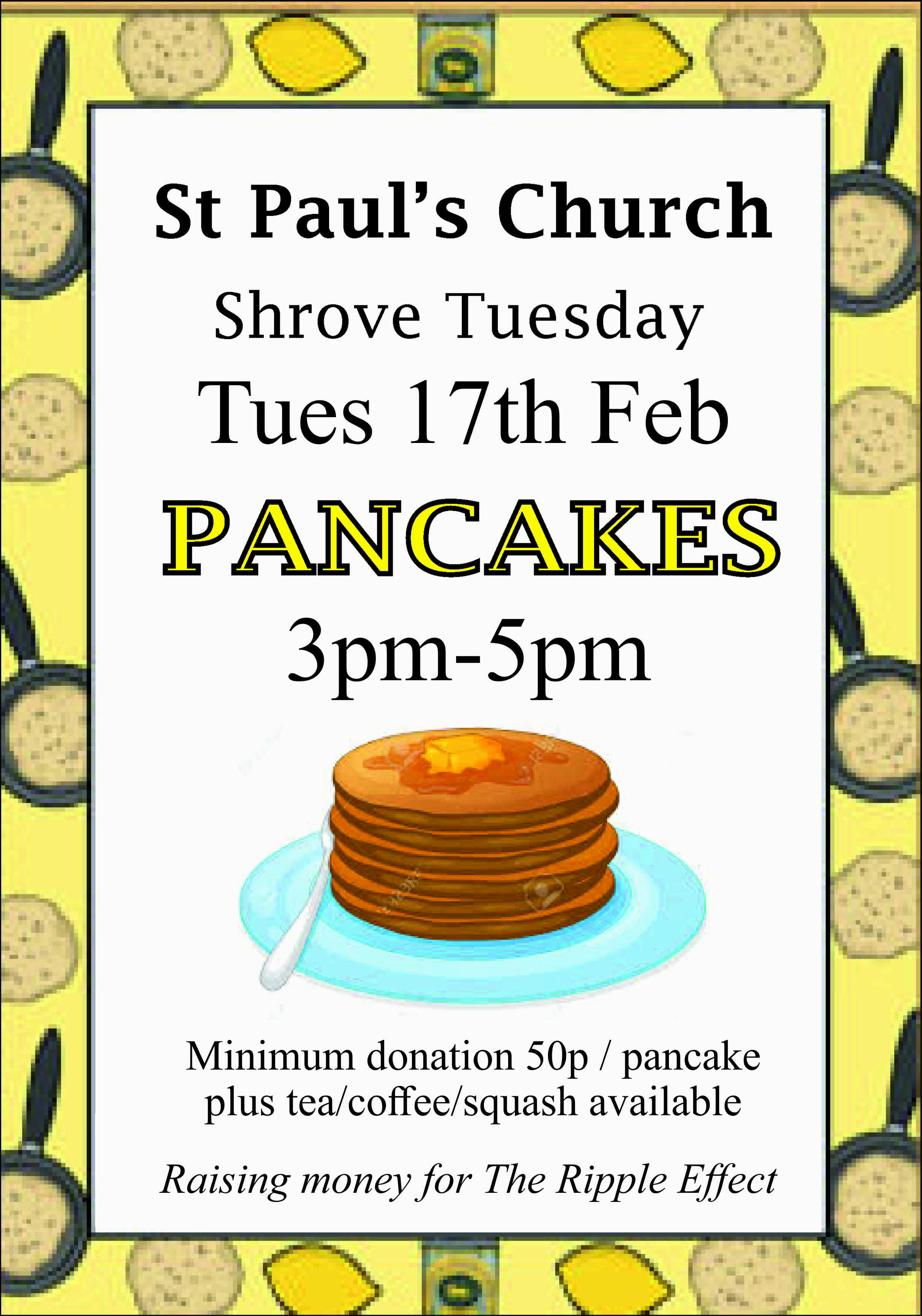 Suggested donation 50p per pancake, donations to Ripple Effect, our charity for Lent