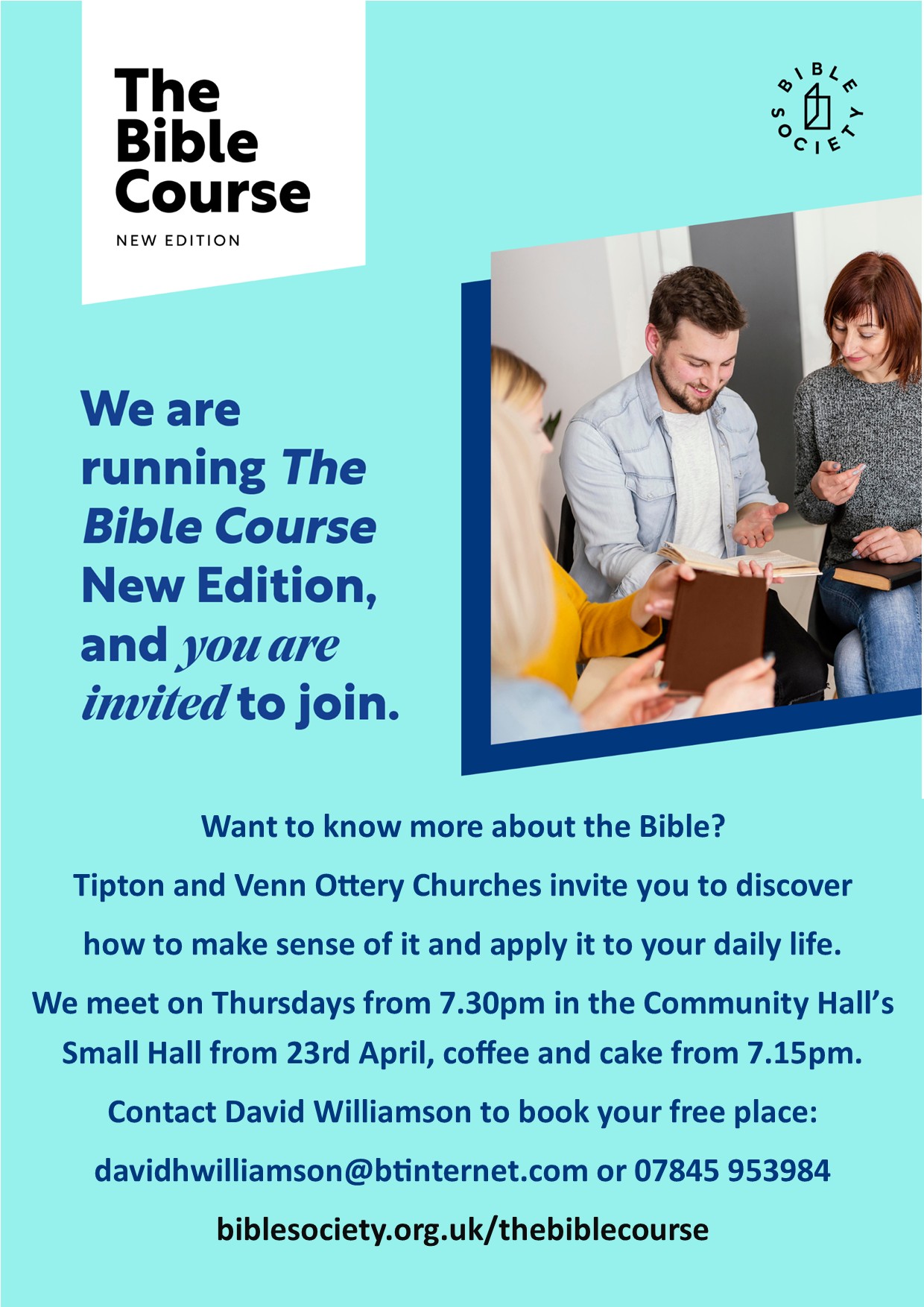 To help us all grow in our understanding of the Bible, whether we’re new to it or life-long readers, we are hosting a series of meetings to help us discover the bigger story that the Bible tells and its significance to each of our lives. Starting on 23rd April in the small hall we will be embarking on ‘The Bible Course’, a video and discussion-based journey through its pages produced by The Bible Society. This fresh, up-to-date presentation of God’s Word is readily accessible by all and will open our eyes and hearts to the treasures it contains. Over 8 sessions – 5 before the school half-term and 3 after – we will grow in our love and appreciation of God’s beautiful gift to us. We will begin with coffee and refreshments at 7.15pm ready for a 7.30pm start, aiming to finish each week by 9pm. If this is of interest to you then please call on 07845 953984 or email David to let him know so we can provide the right number of course books – they will be free for all who come – and know how much cake to bake!