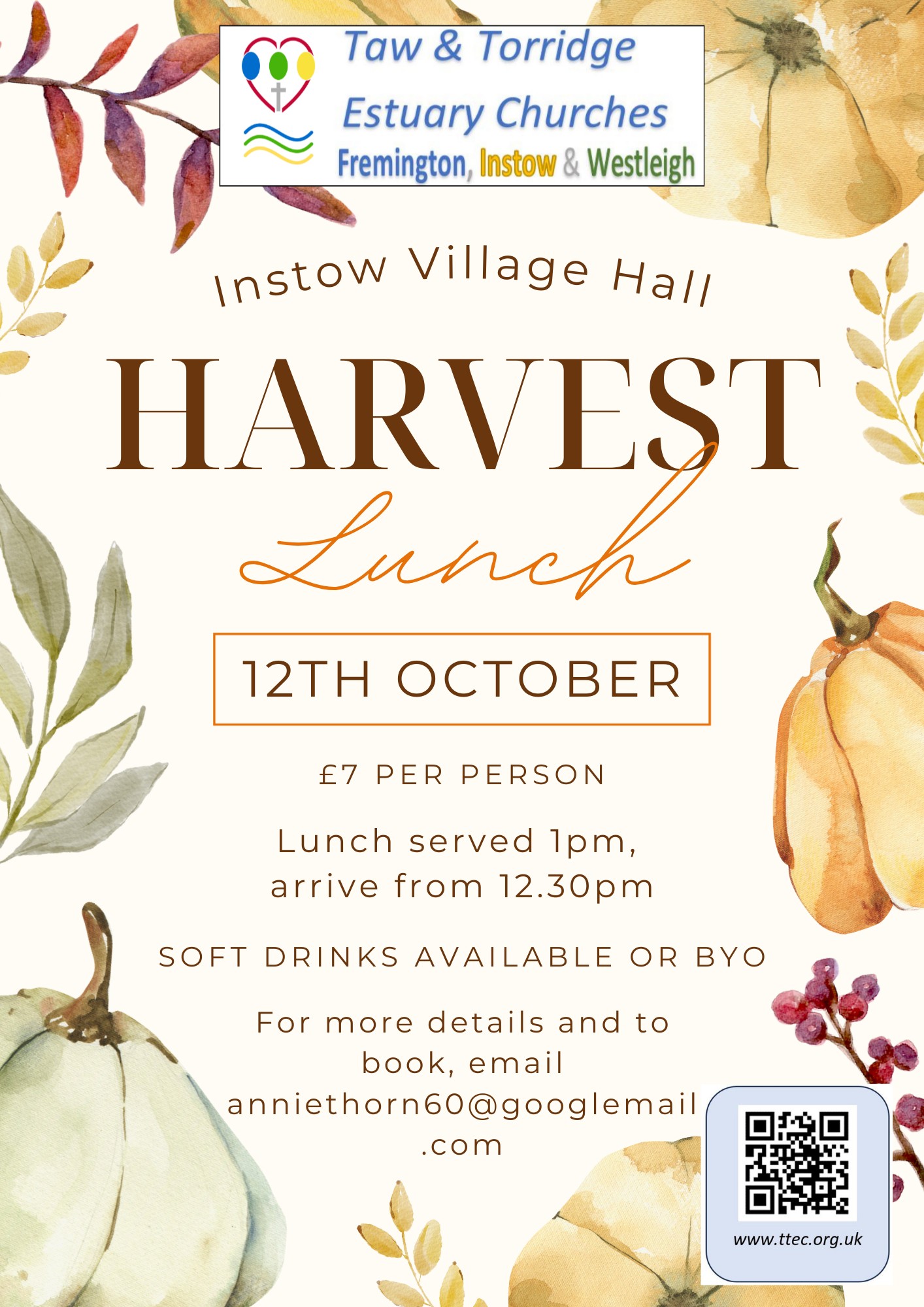 Please come to our Harvest Lunch at Instow Village Hall on Sunday 12th October 13:00-14:30pm.