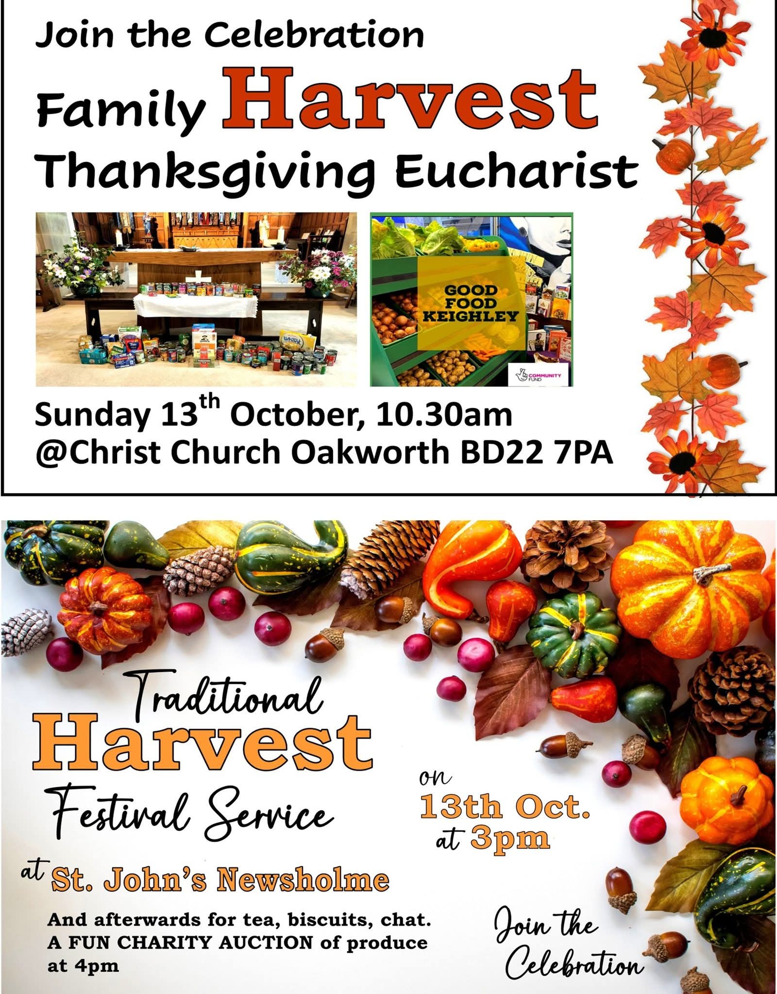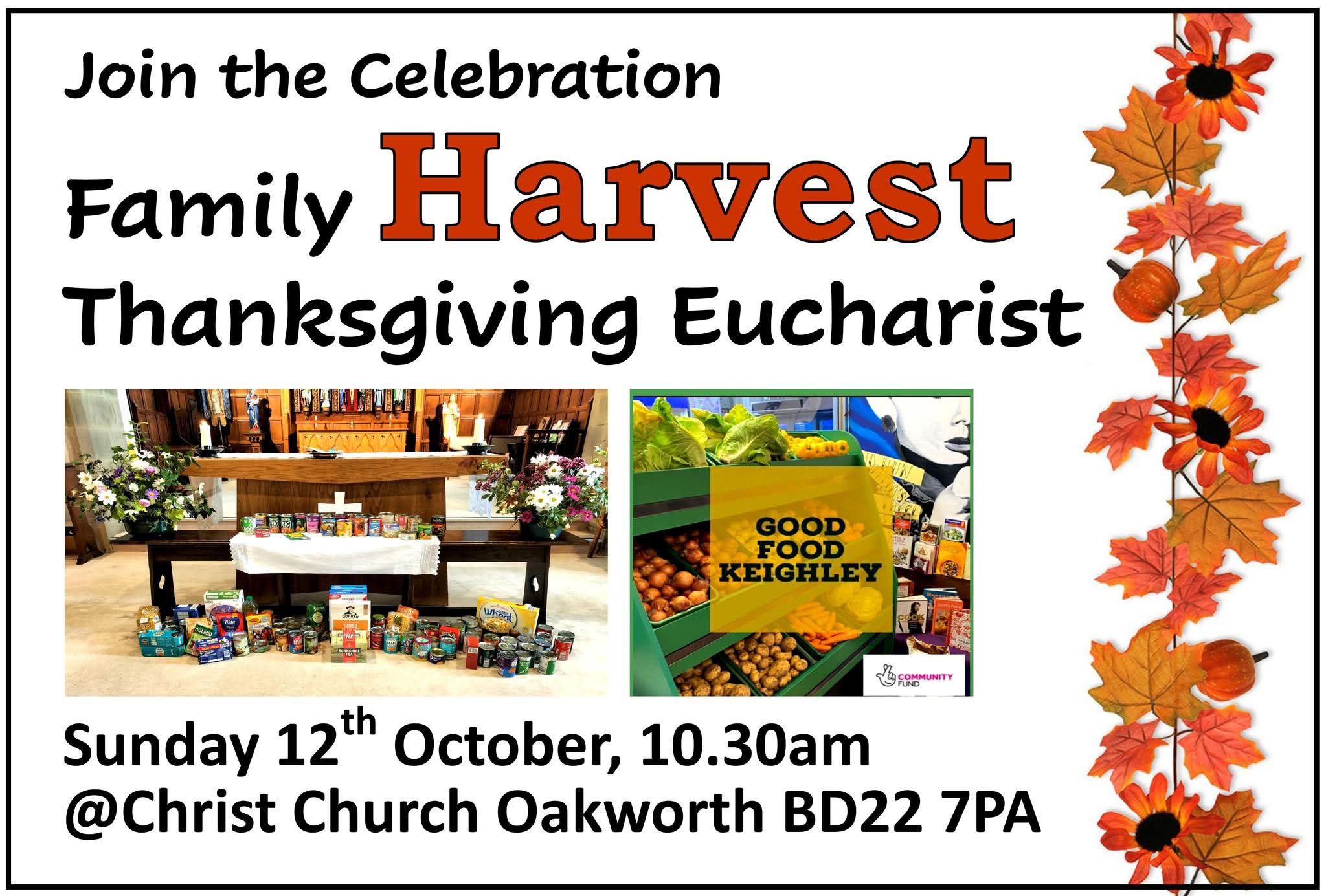 10.30am Family Thanksgiving Harvest service including communion at Christ Church Oakworth. We are collecting non perishable foods items like tins, pasta, cereals etc., for the social supermarket GOOD FOOD KEIGHLEY.