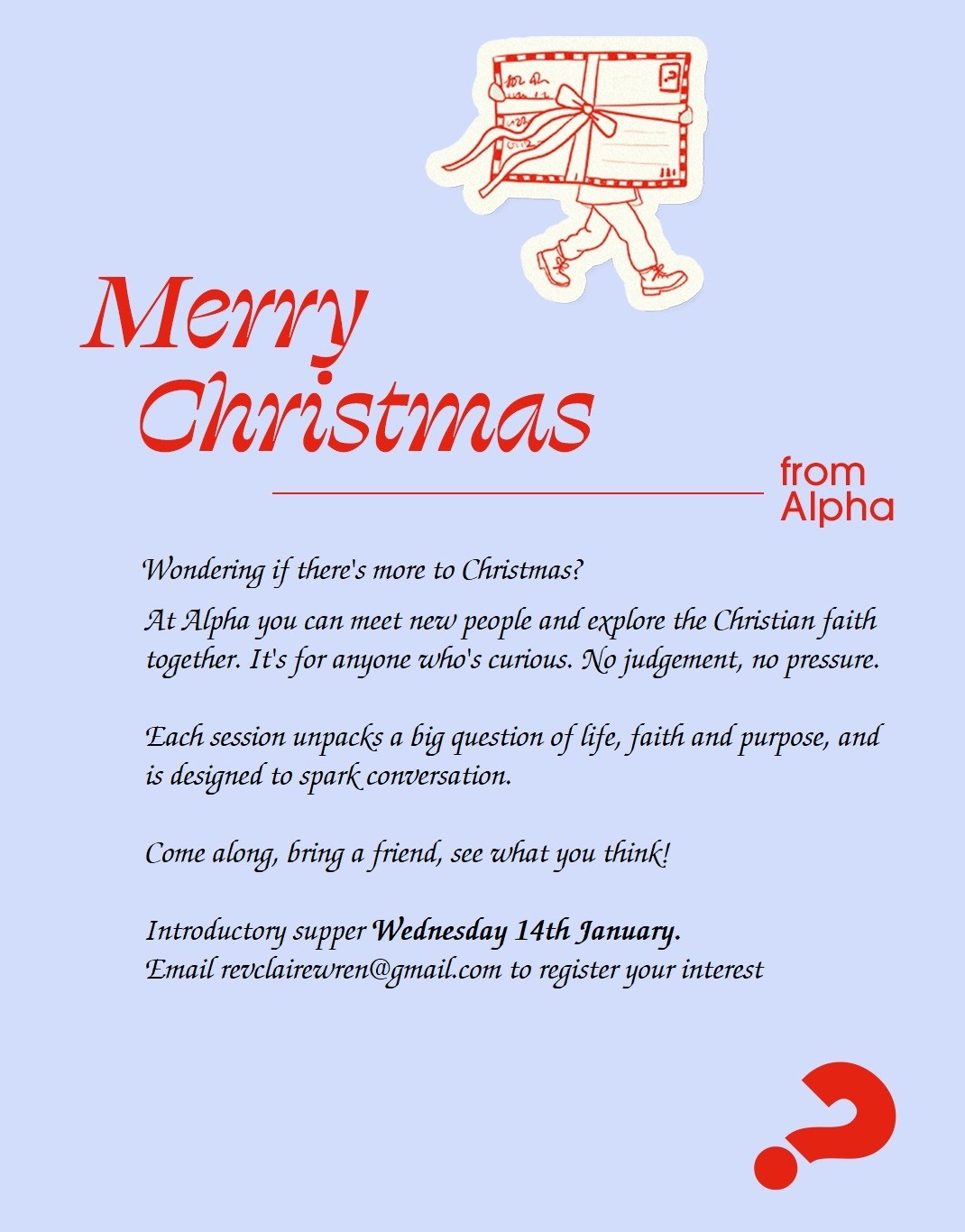 To find out more about being a Christian, have a look at our Learning page, or Get in touch. In January 2024 an Alpha course starts, contact Revd. Claire Wren [email protected] for details. The Alpha course is a first step to learning about the Christian faith, and it includes a meal around which relevant topics are discussed.