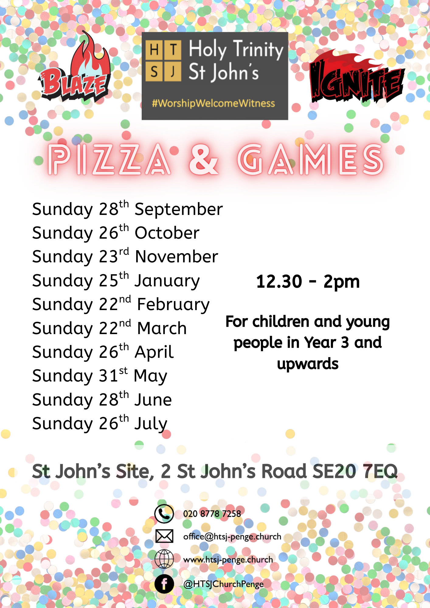 For children and young people from Year 3 upwards. Stay on after church to enjoy board games, craft and more active sports, with pizza! Normally on the first Sunday of the month, but check attached flier for details.