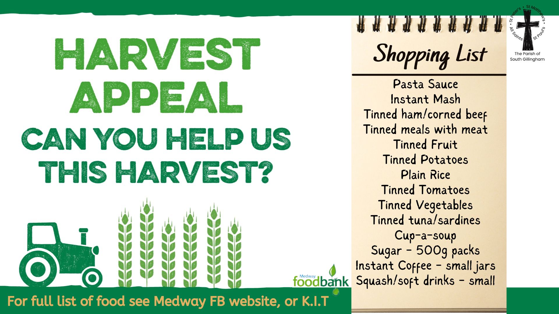 During the service we will be collecting donations of tinned food to support the work of our local Medway Foodbank.* Food can also be donated before hand during the week - just leave at the front of church. Thank you!