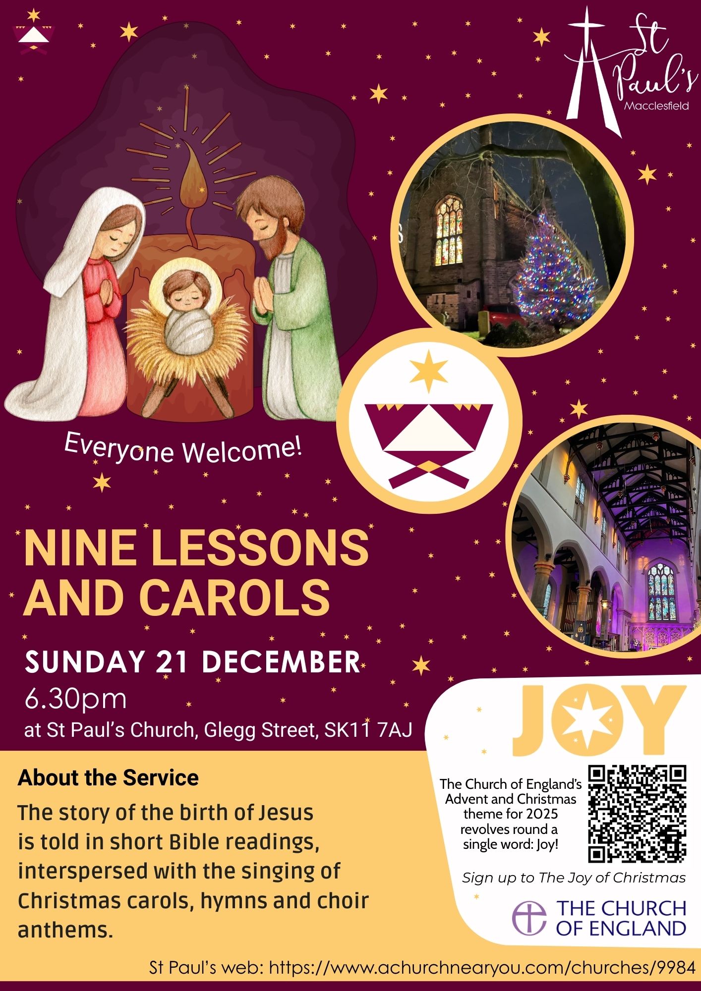The story of the birth of Jesus is told in short Bible readings, interspersed with the singing of Christmas carols, hymns and choir anthems.